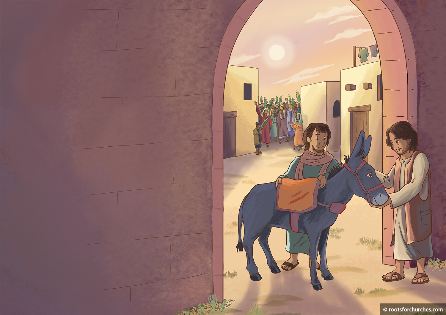 Donkey on red carpet; disciples untie colt; disciples untie colt bw; entering Jerusalem; storybook